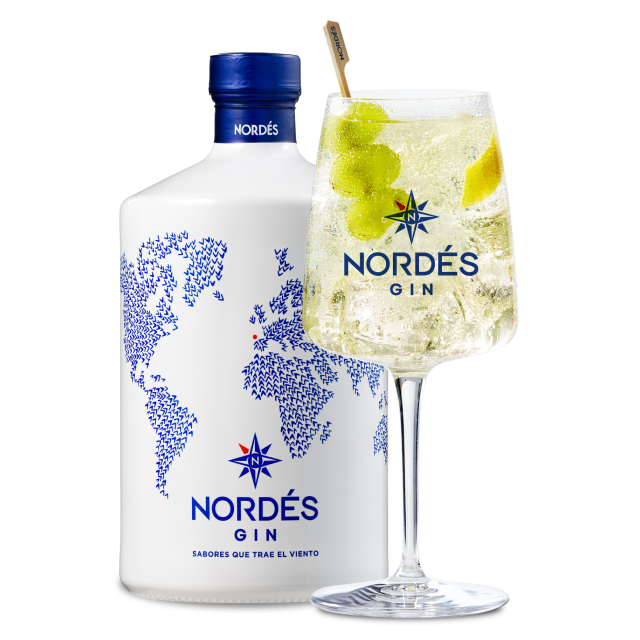 Botella Nordés Gin 70cl + 2 copas de Nordesiño + medidor de cerámica + cuchara removedora.